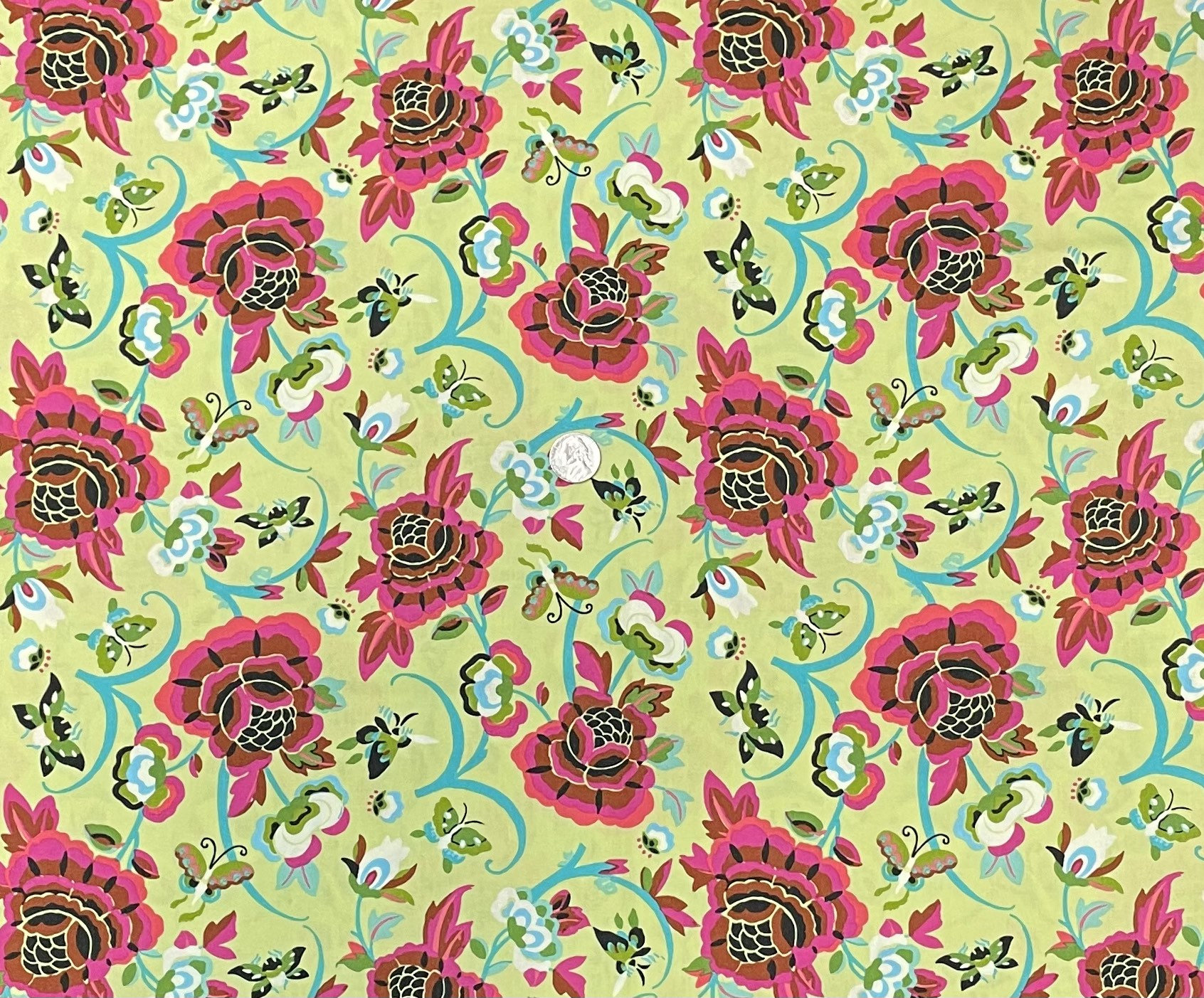 Amy ButlerField FollyCPAB 015Out of Print rareGreen background, multicolor flowers, butterfliesBy the yard multiple yards cut in continuous piece100% cotton machine wash tumble dry No bleach no dry cleaning