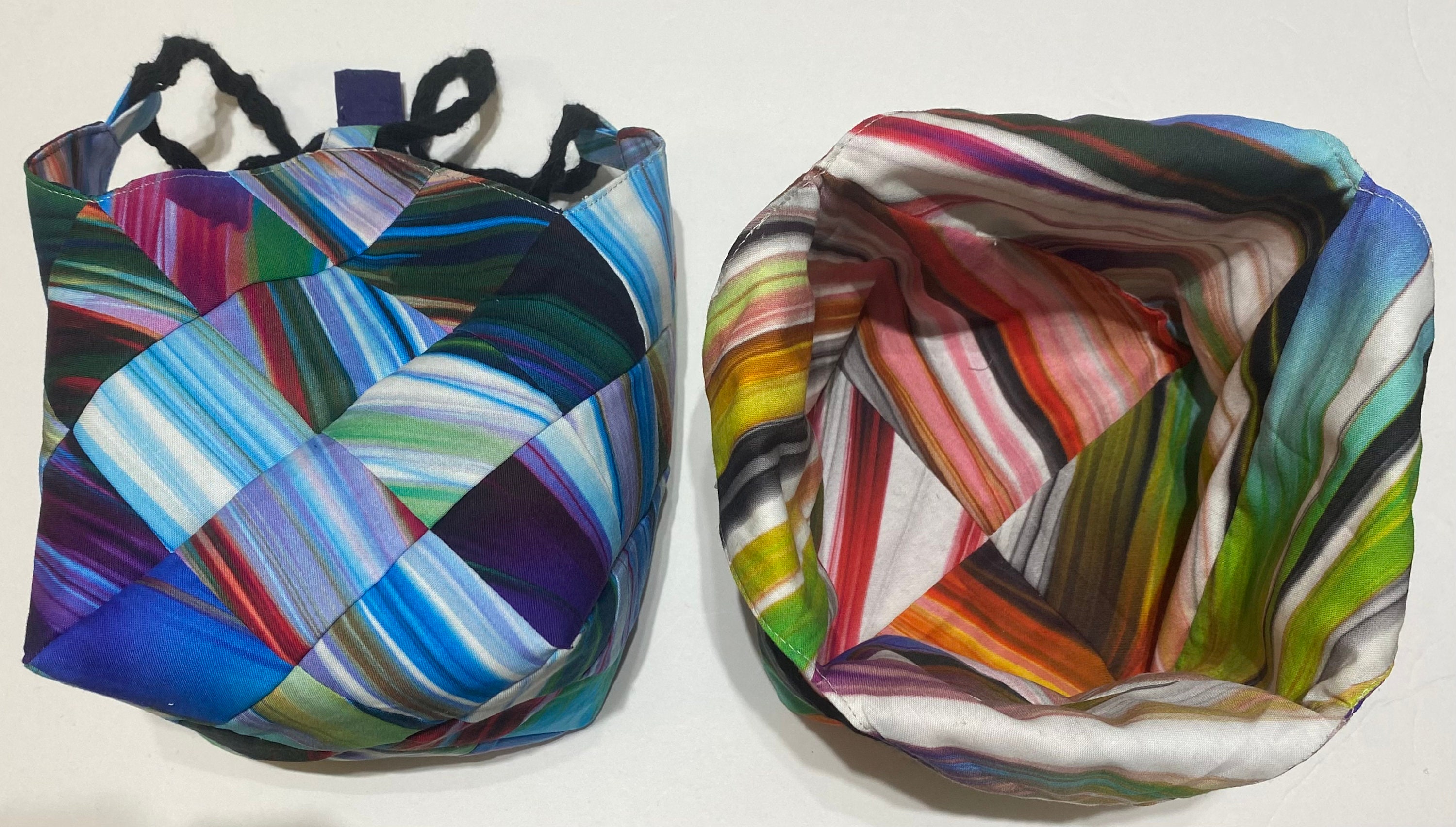 pattern, instructions, interfacing, fabric panel, and cording to make two bags.