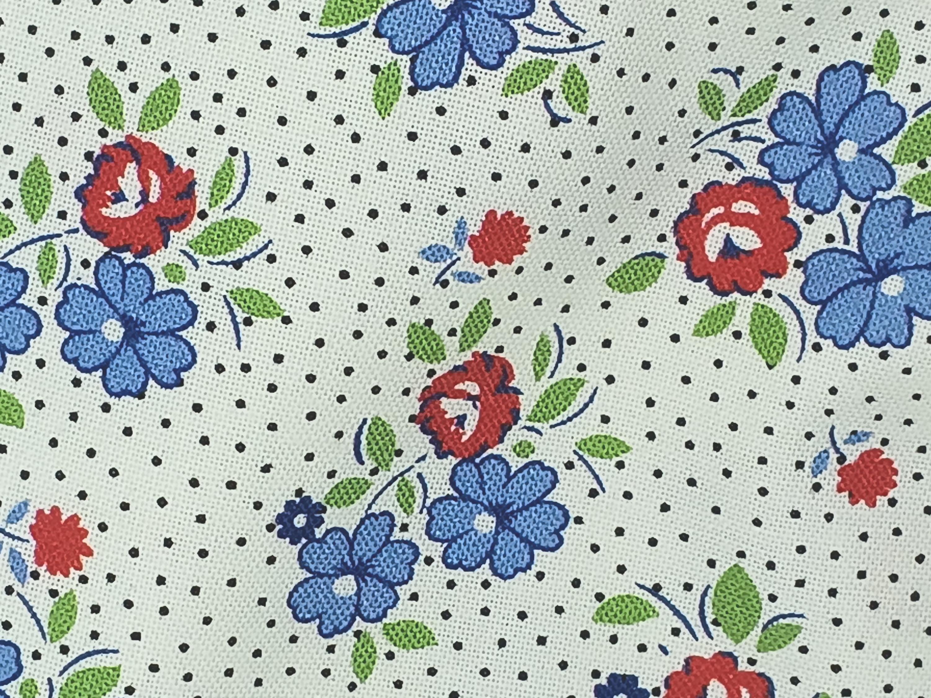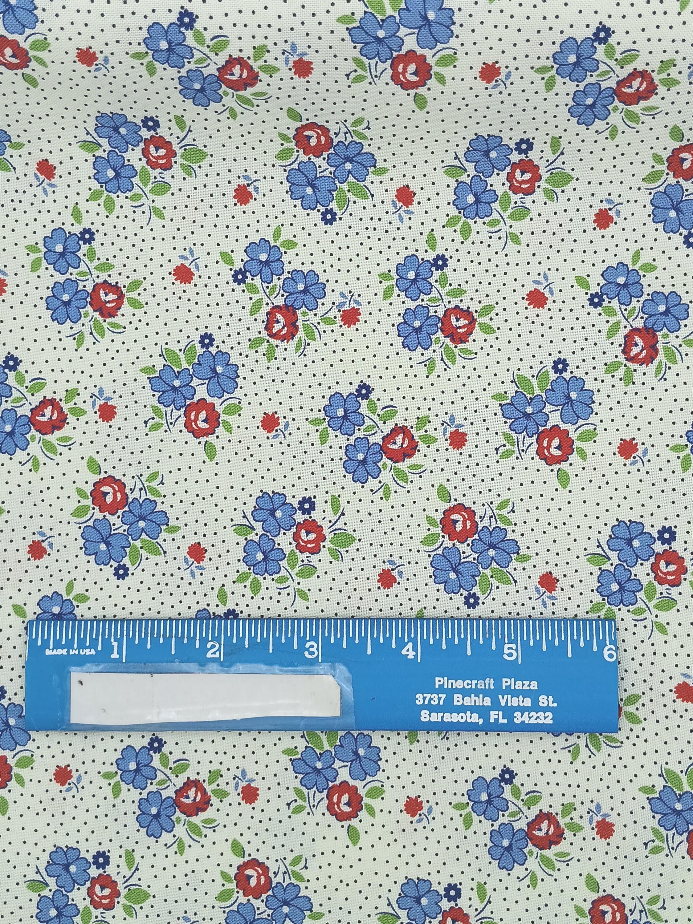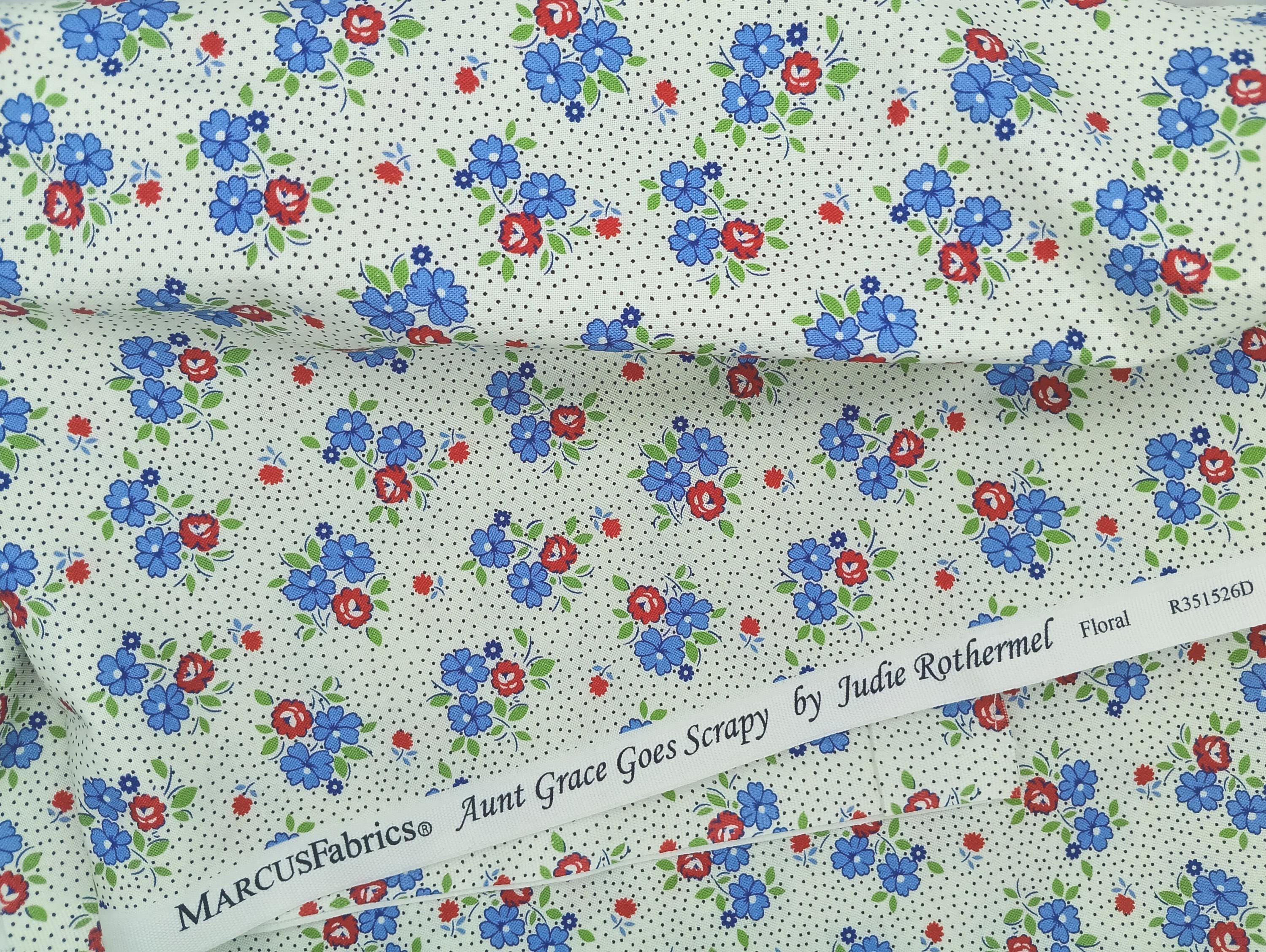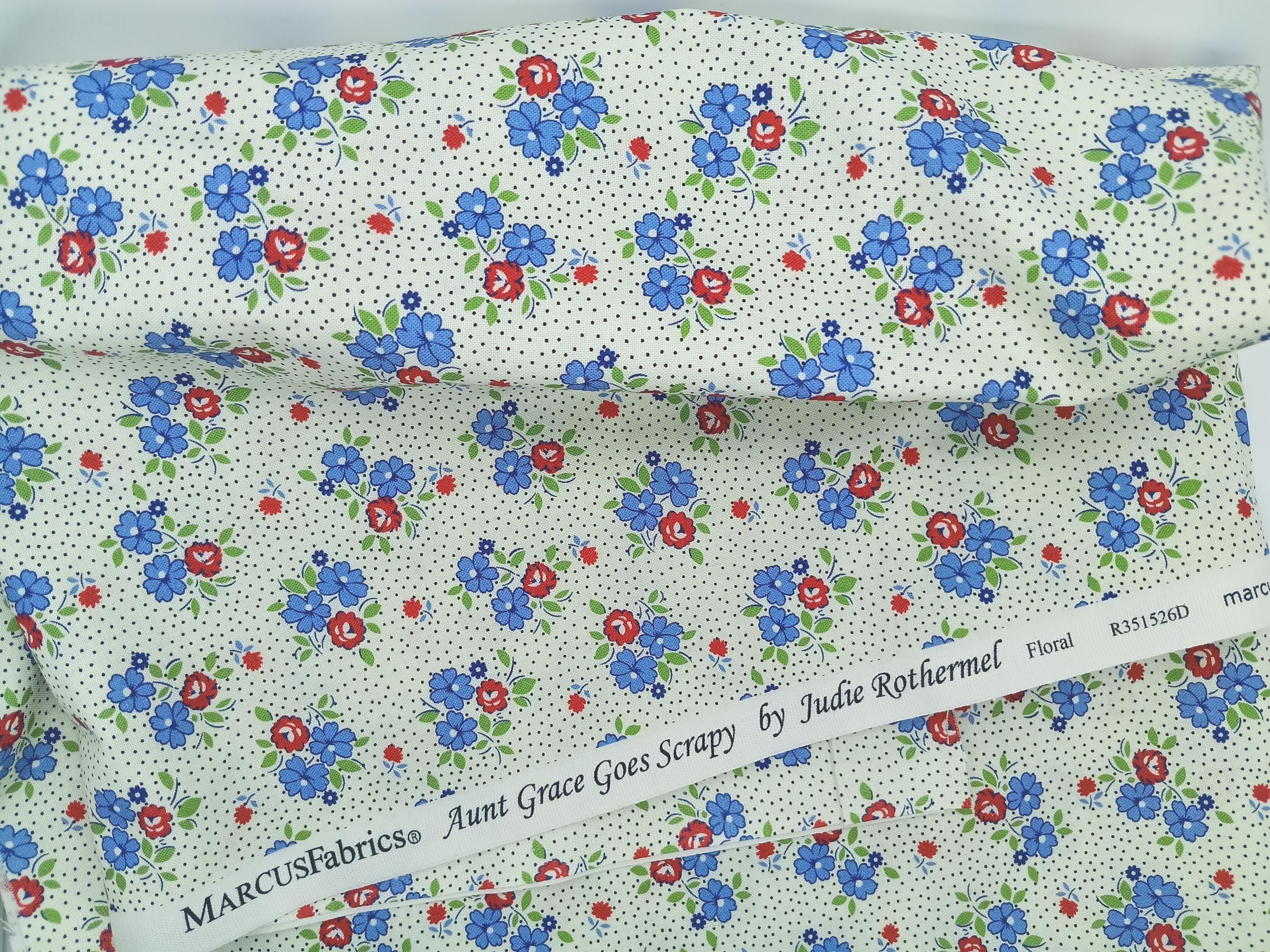 100% cotton print feedsack 20s 30s depression era Aunt Grace Goes Scrappy by Judie Rothermel for Marcus Fabrics red and blue flowers on ivory wash warm mild soap no bleach no dry cleaning Sold by the yard