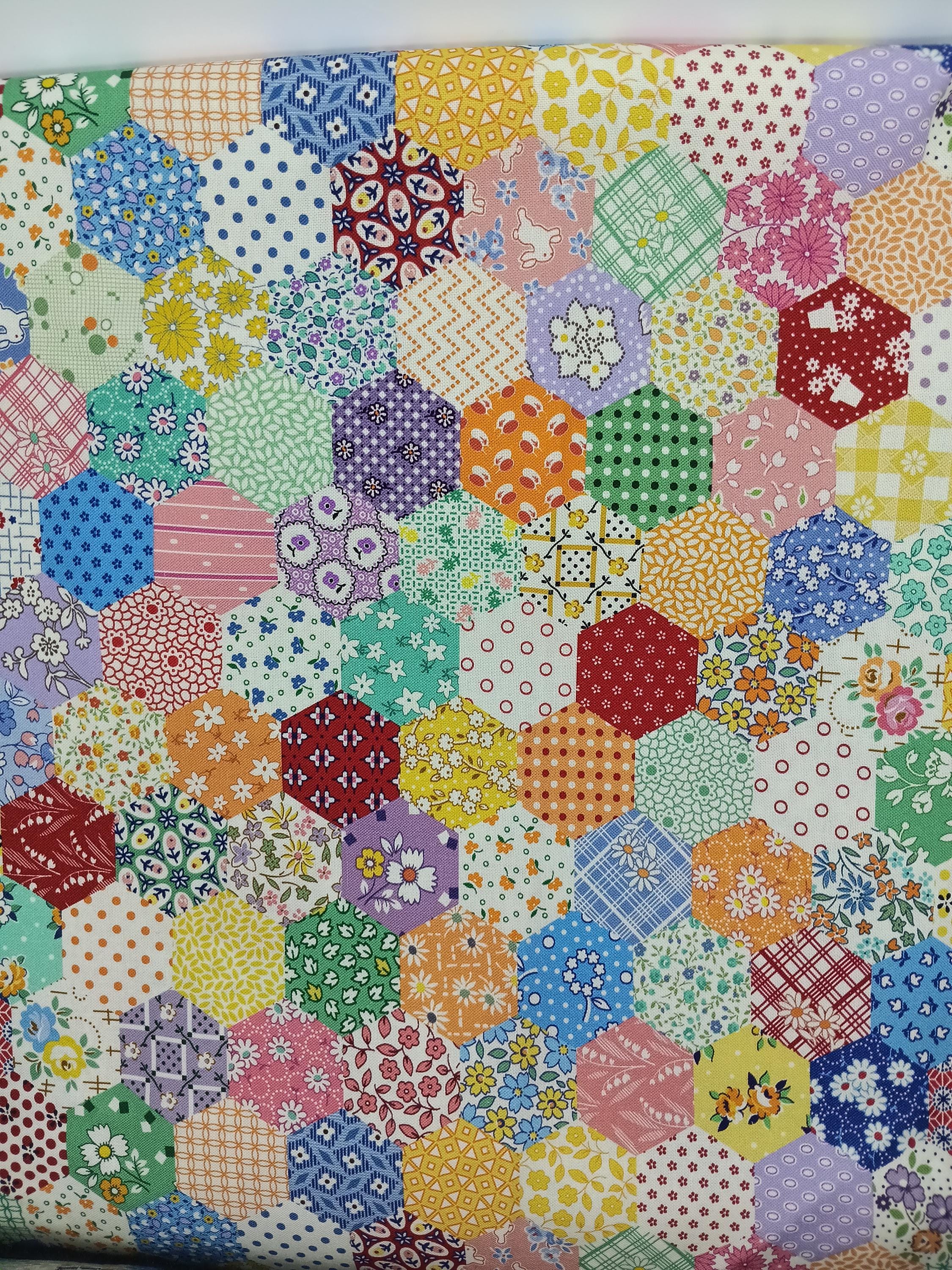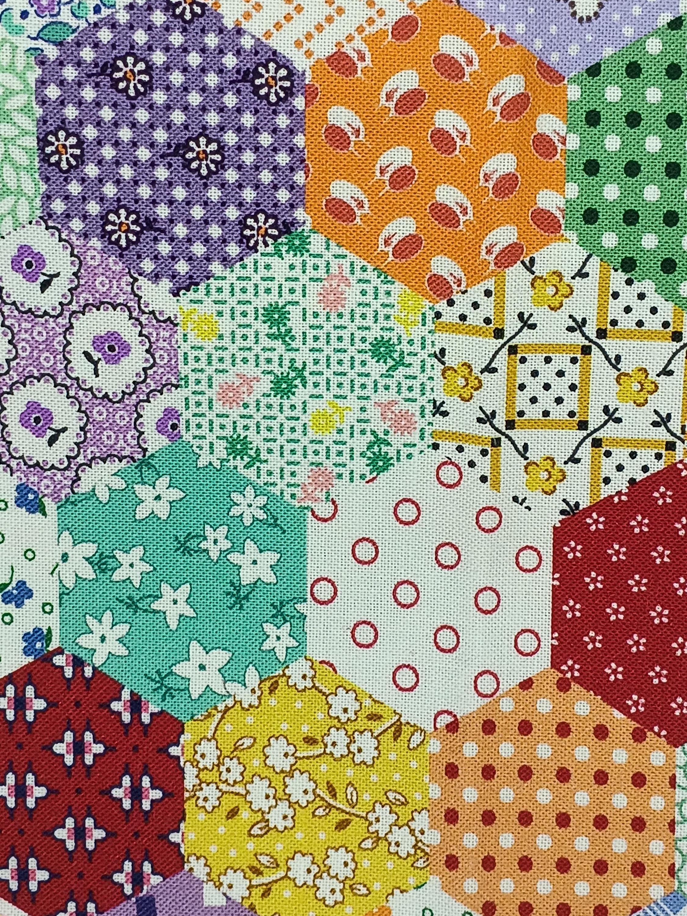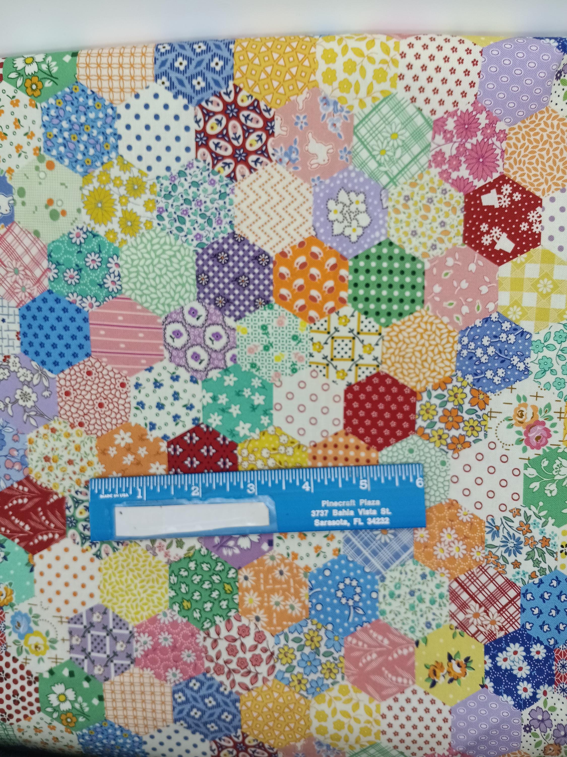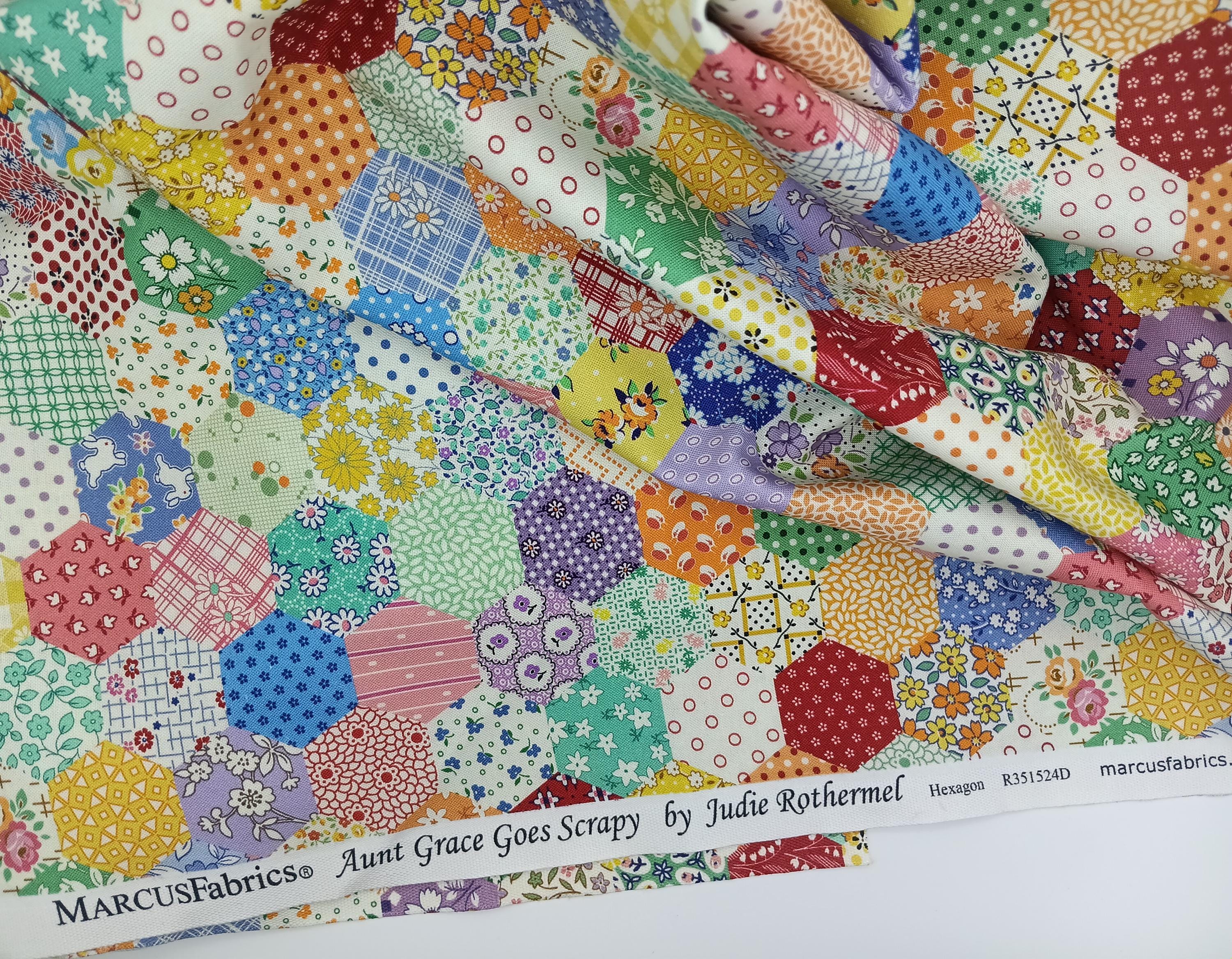 100% cotton Feedsack print depression eraAunt Grace Goes Scrappy by Judie Rothermel for Marcus Fabrics Hexagon printWash warm mild soapNo bleach no dry cleaningSold by the yard