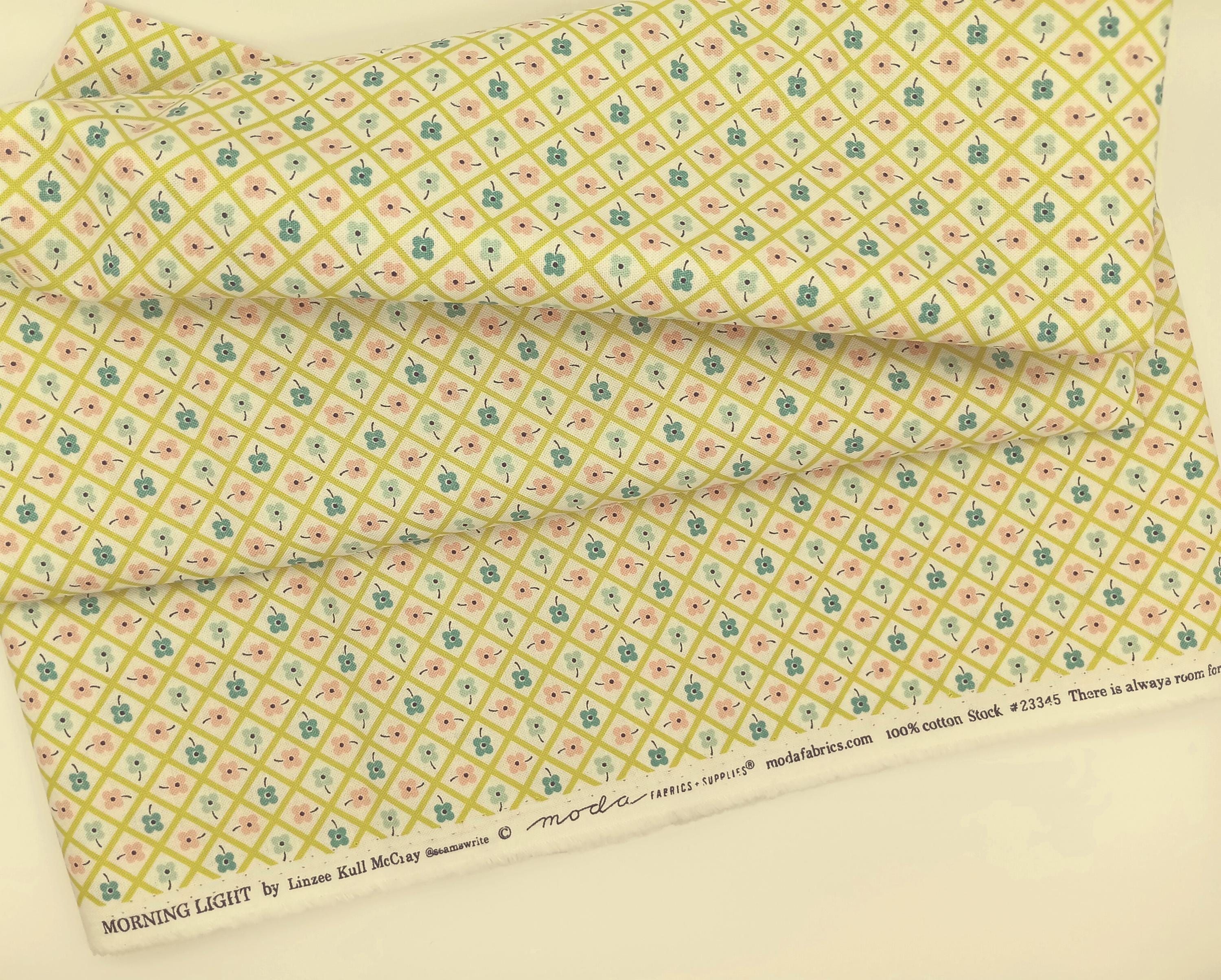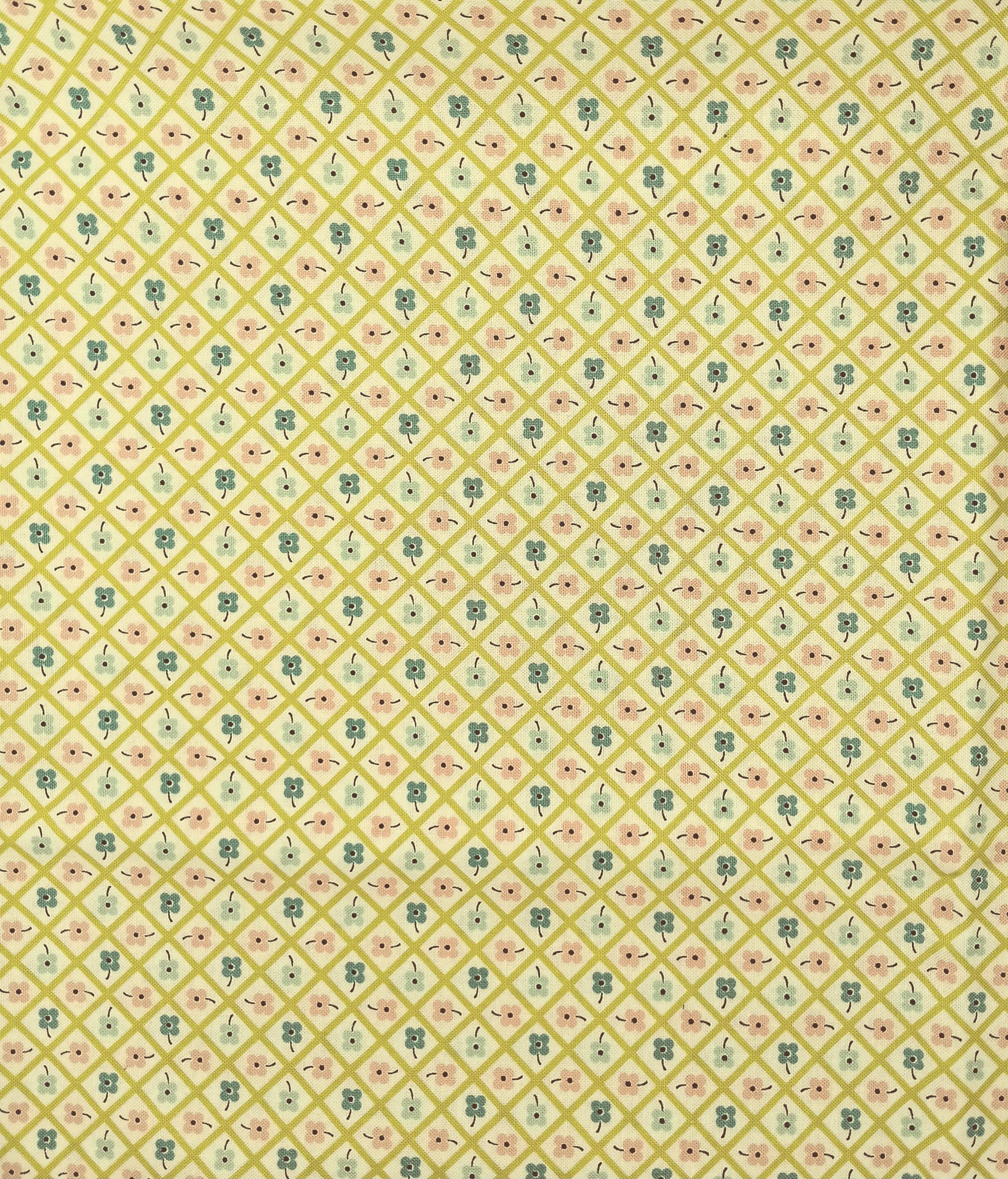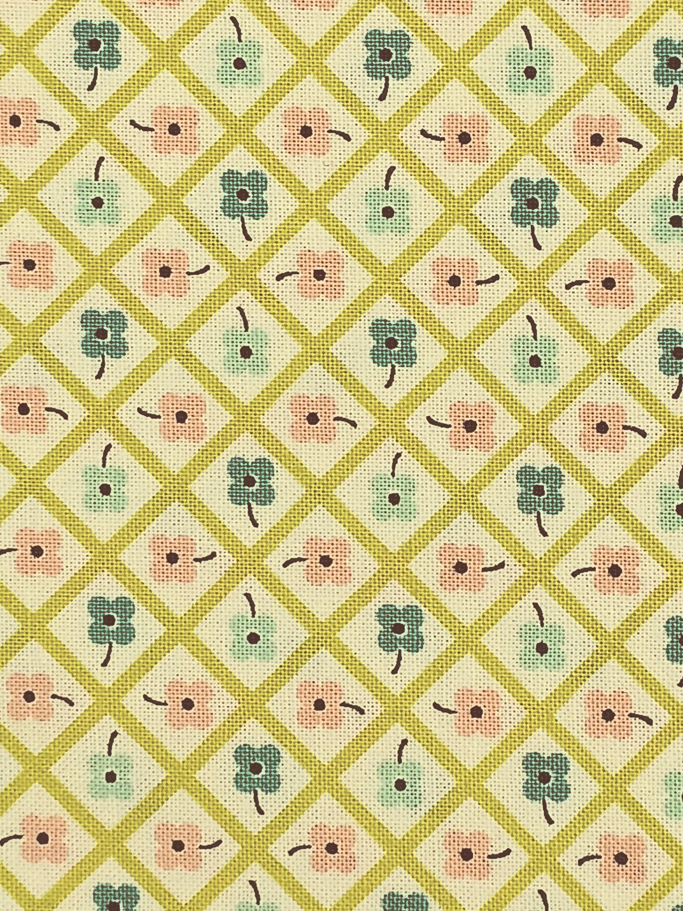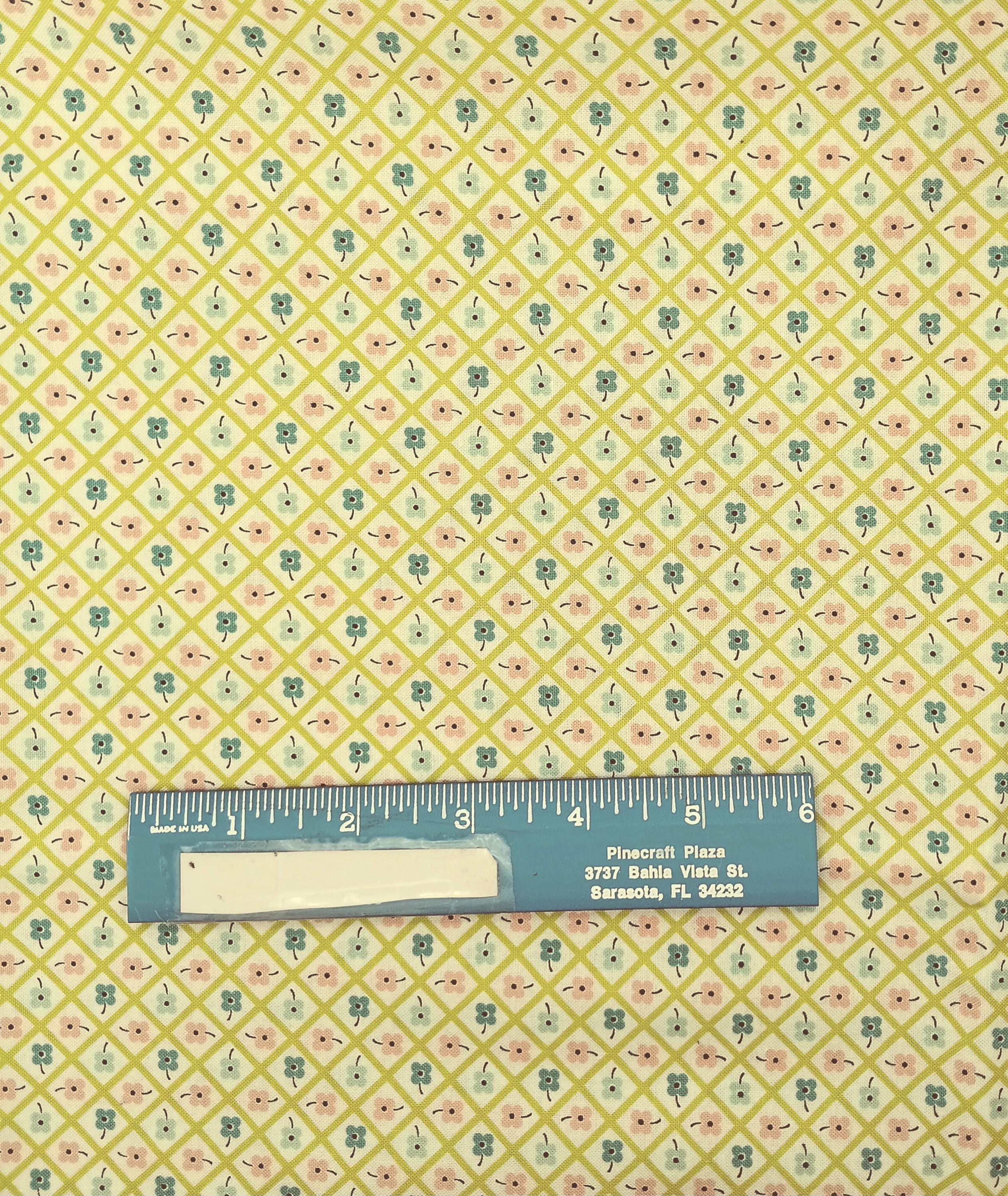 100% cotton 20s 30s Feedsack print depression eraMorning Light by Linzee Kull McCray Moda FabricsPink and blue flowers and gold lattice on white background Wash warm mild soapNo bleach no dry cleaningSold by the yard