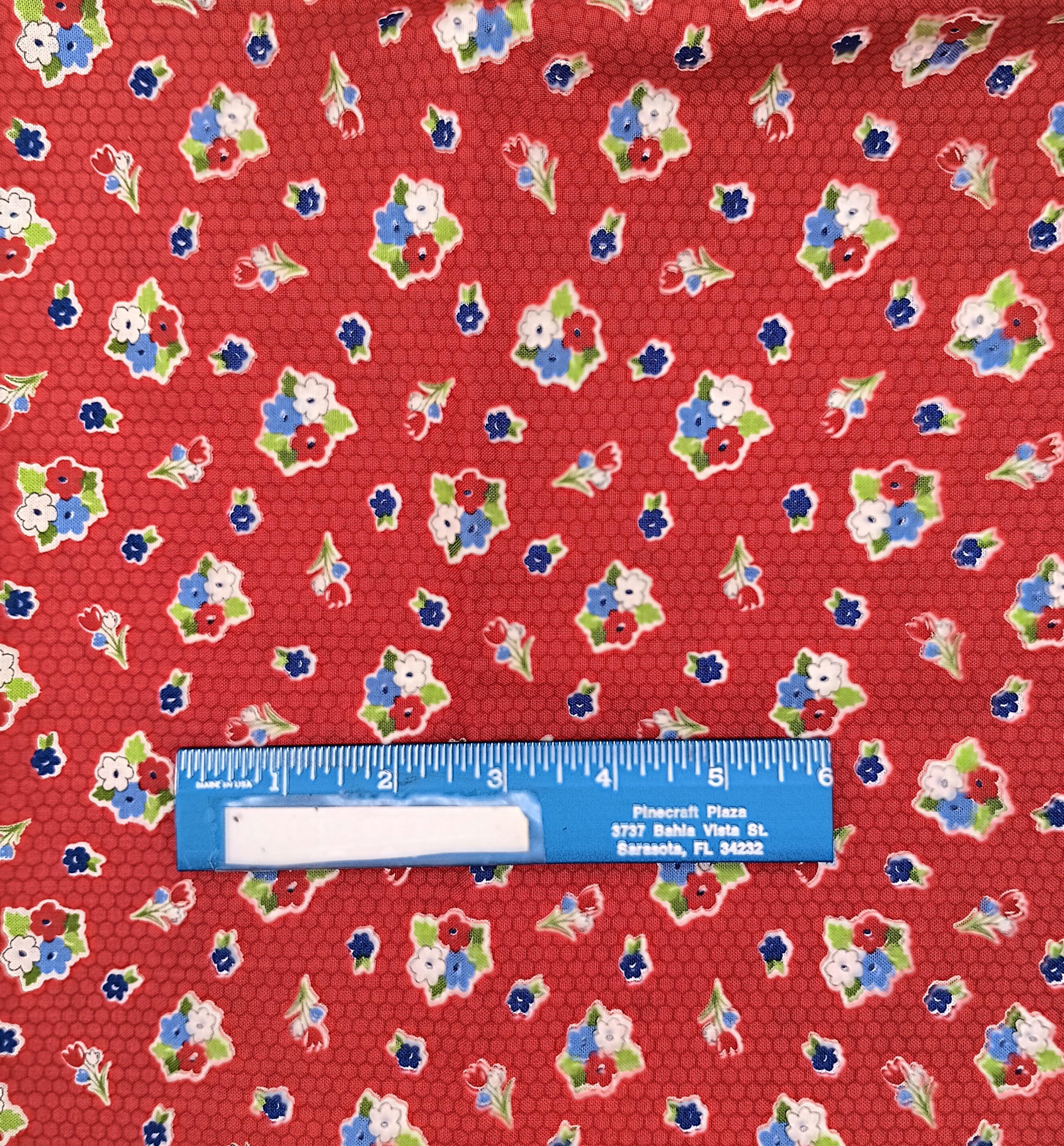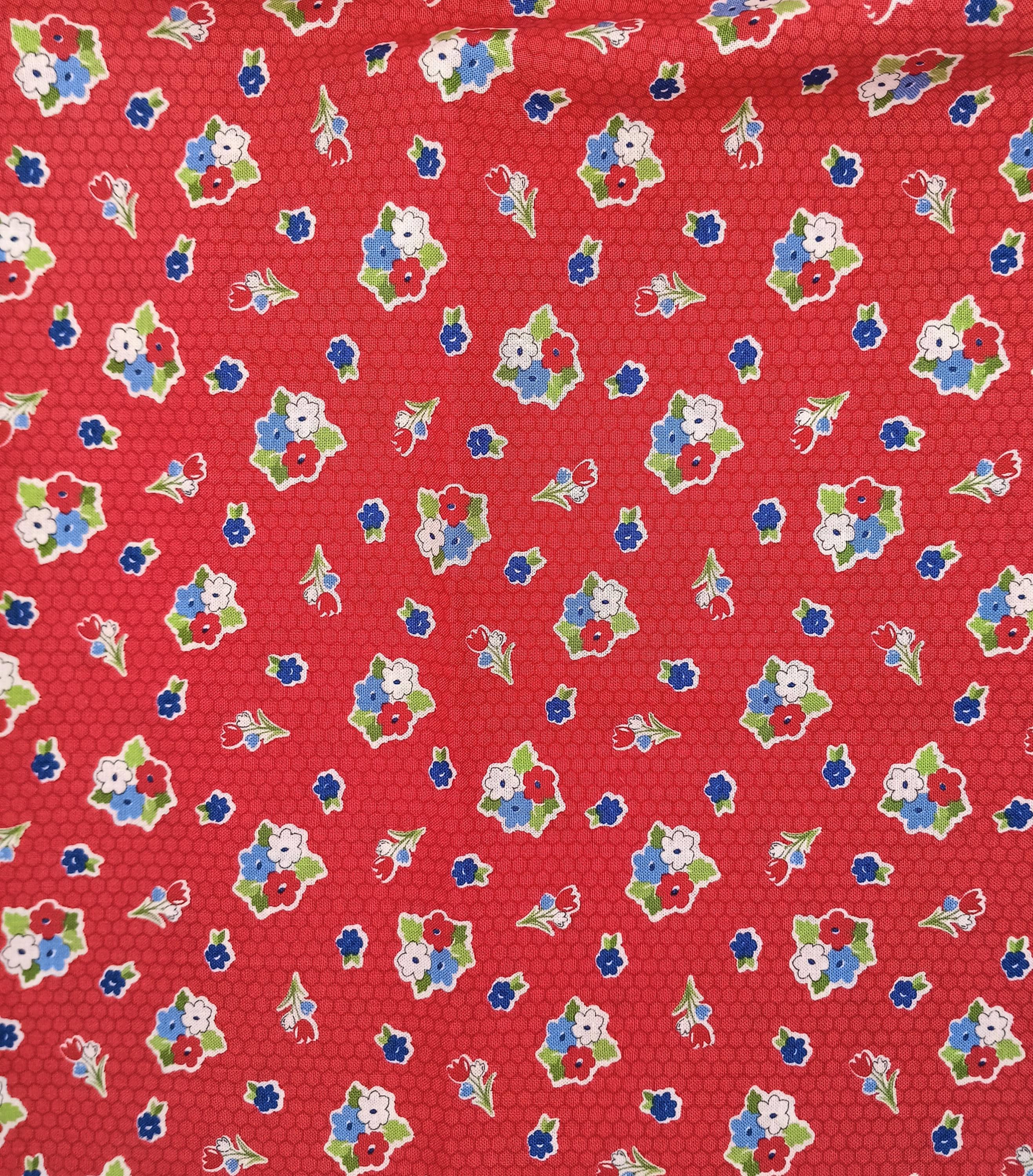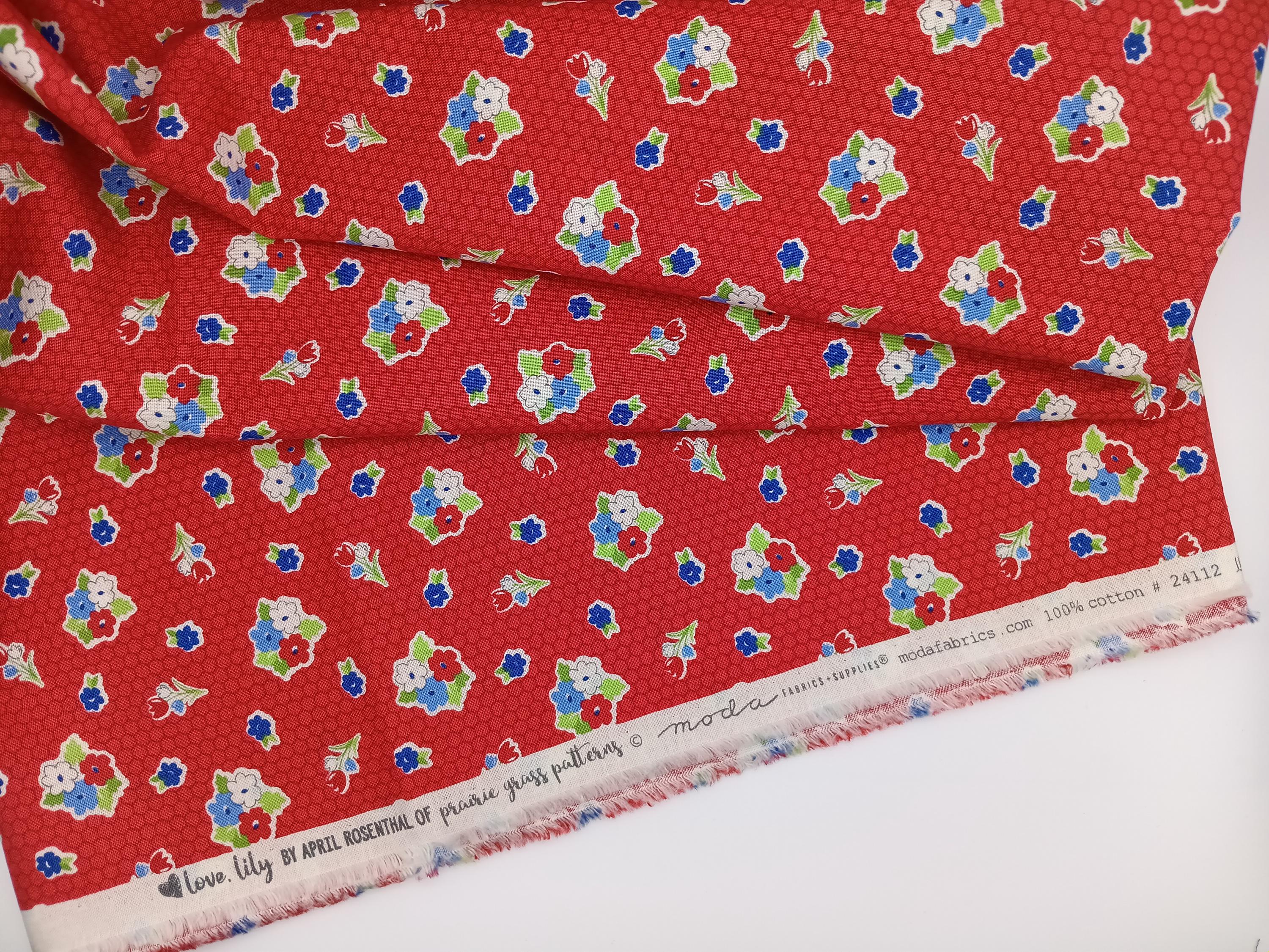20s 30s feedsack depression print Love Lily by April Rosenthal of prairie grass patterns 100% cotton Moda Fabrics 24112 Red with red, white and blue flowersSold by the yardWash warmDo not dry clean