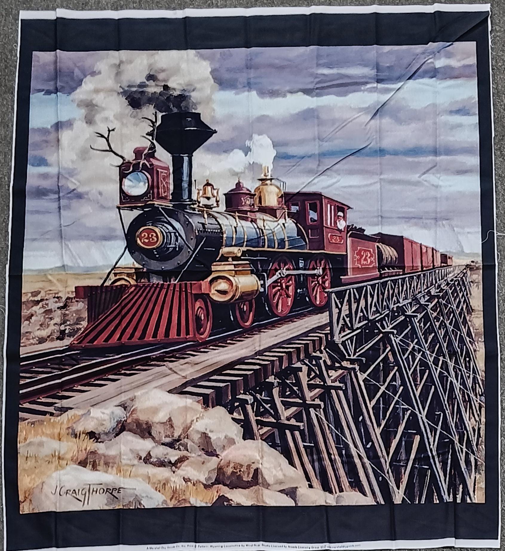 Wyoming locomotive train, rare Ansada licensing Wind River Studio, J Craig ThorpeOne yard panel 36x45 inches100% cotton Machine wash. No bleach no dry cleaning
