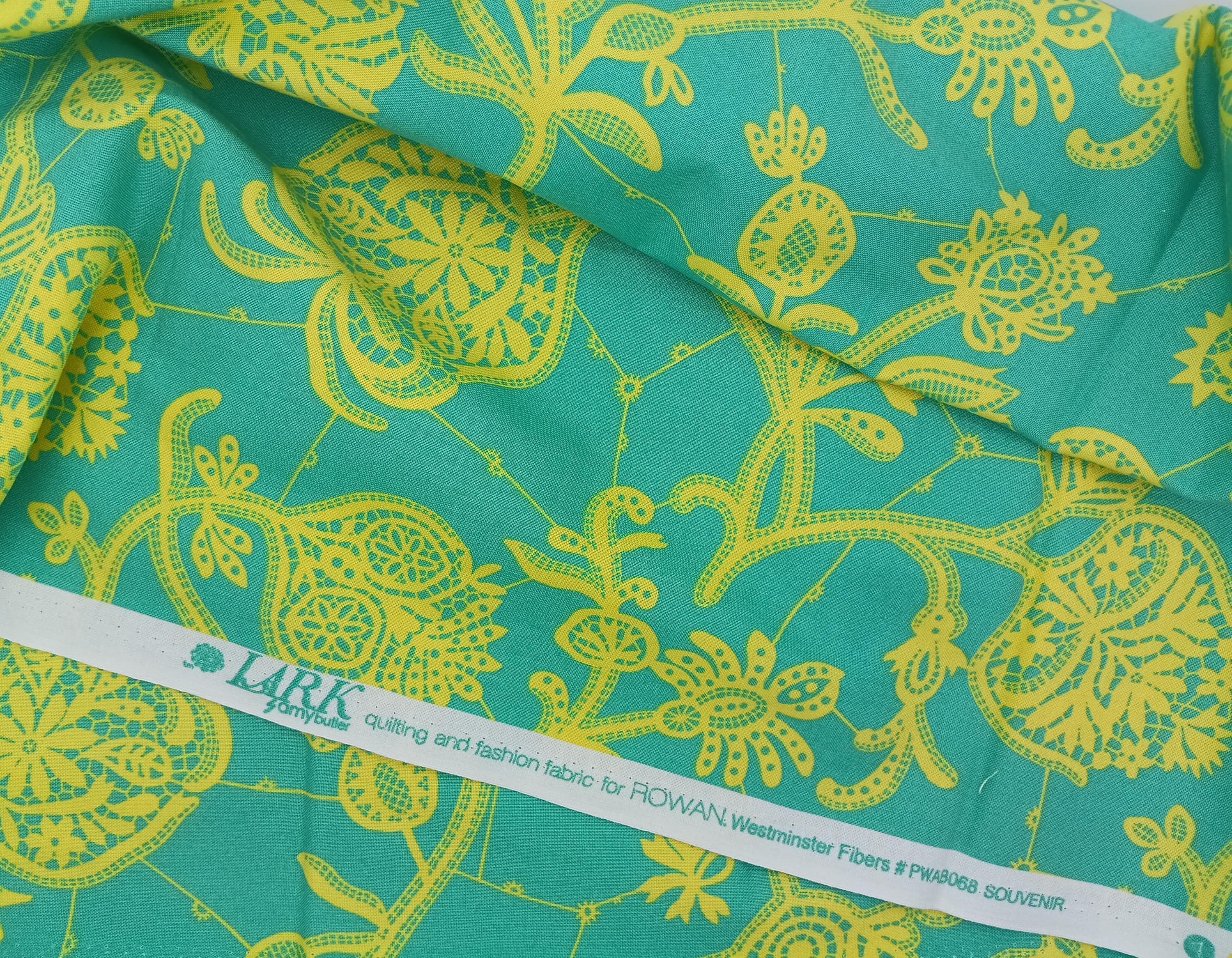 Amy Butler - Lark - Souvenir PWAB068Rare OOPYellow print on light teal backgroundWestminster fibersmachine wash, tumble dryno bleach no dry cleaning