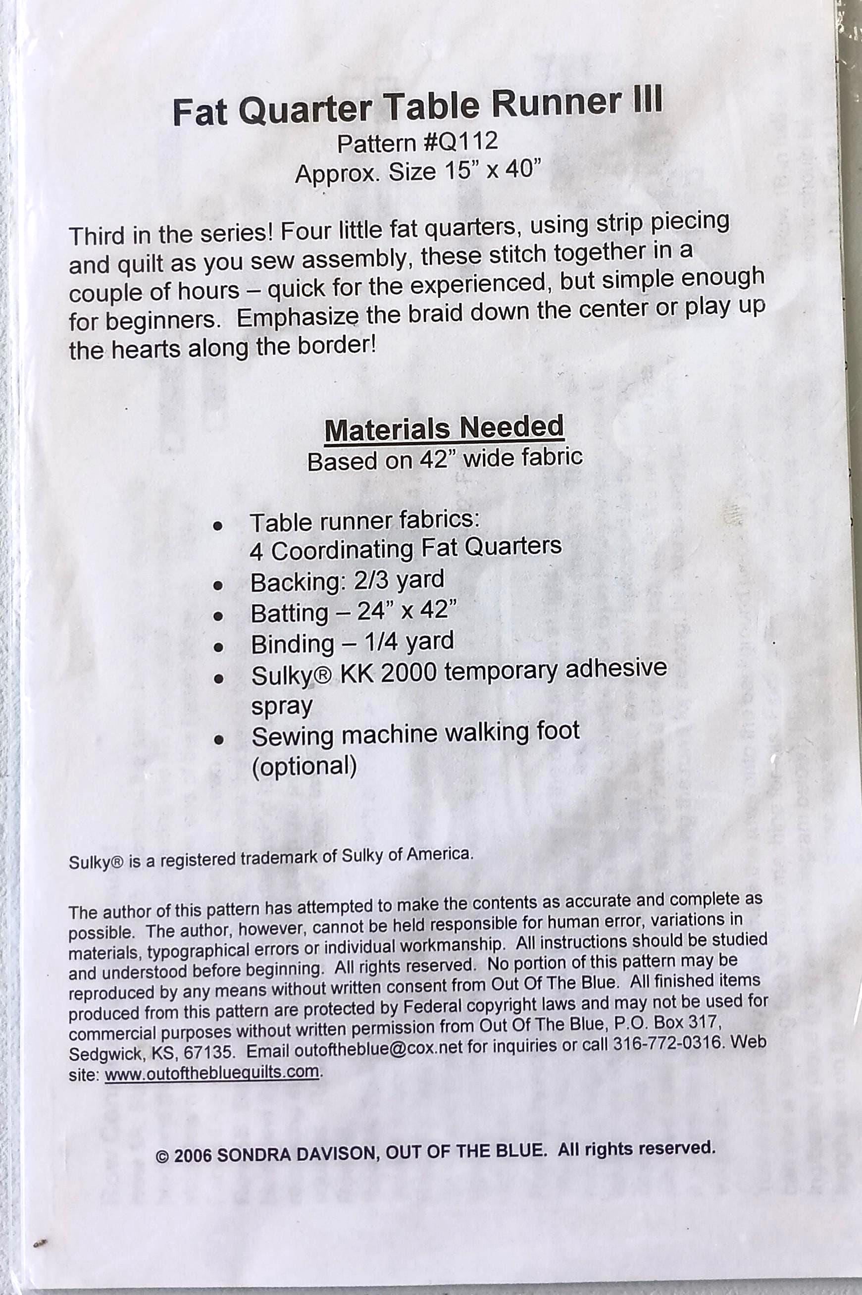 Fat Quarter Table Runner III pattern Quit-As-You-Sew! By Sondra Davison for Out Of The BlueThis is a pattern only no fabric or accessories are included