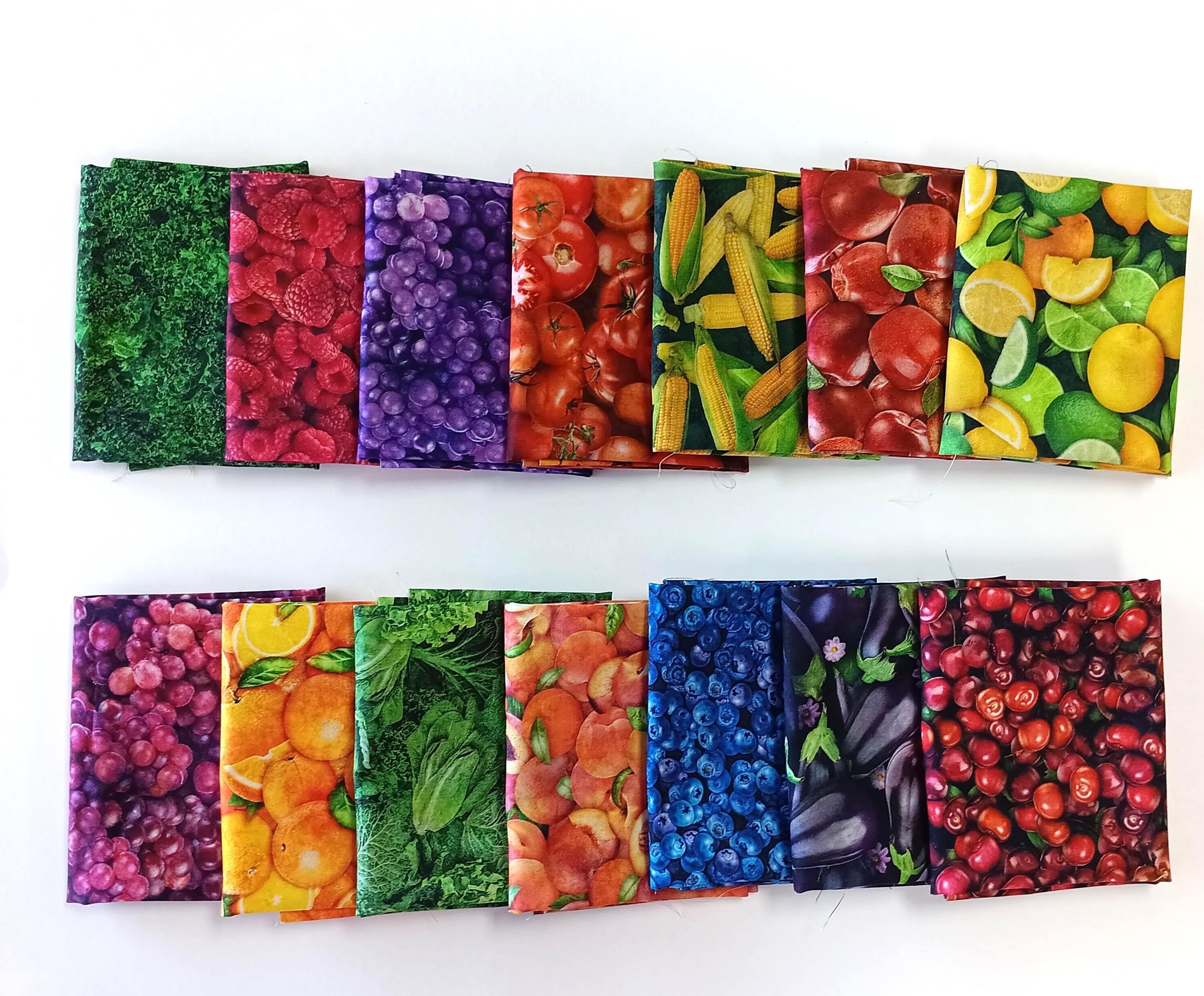 Fruit and vegetable 14 fat quarter bundlfabric by Dan Morris Design for QT Fabrics14 Fat Quarters you will receive this exact bundle100% cottonMachine wash tumble dryNo bleach no dry cleaning