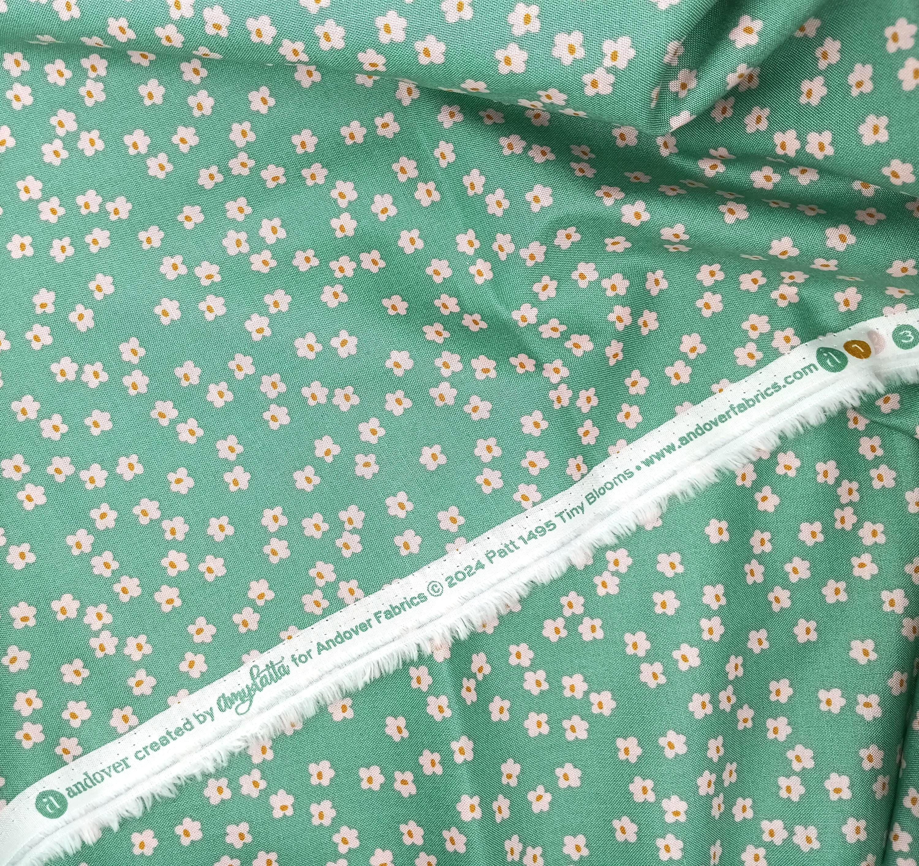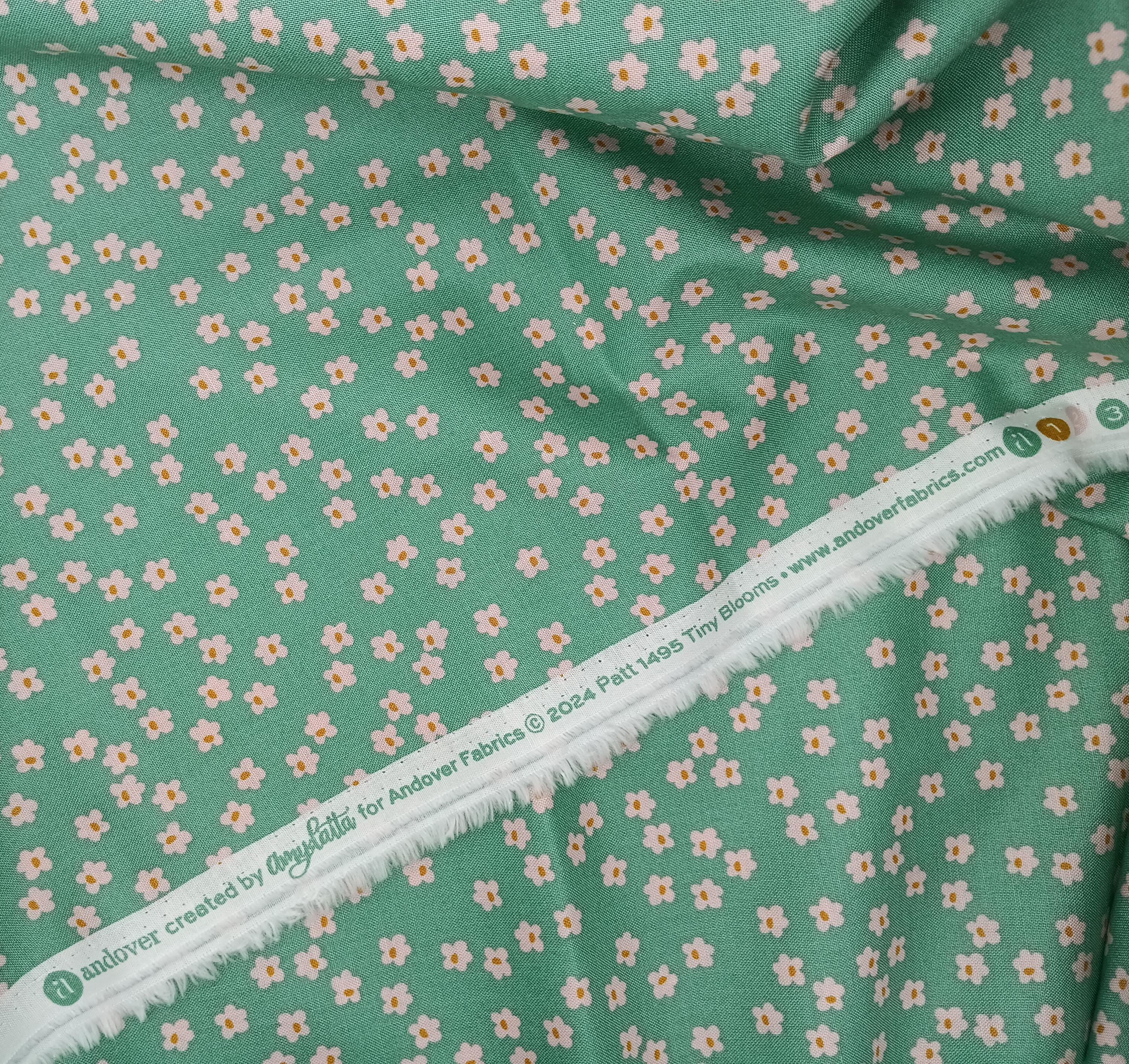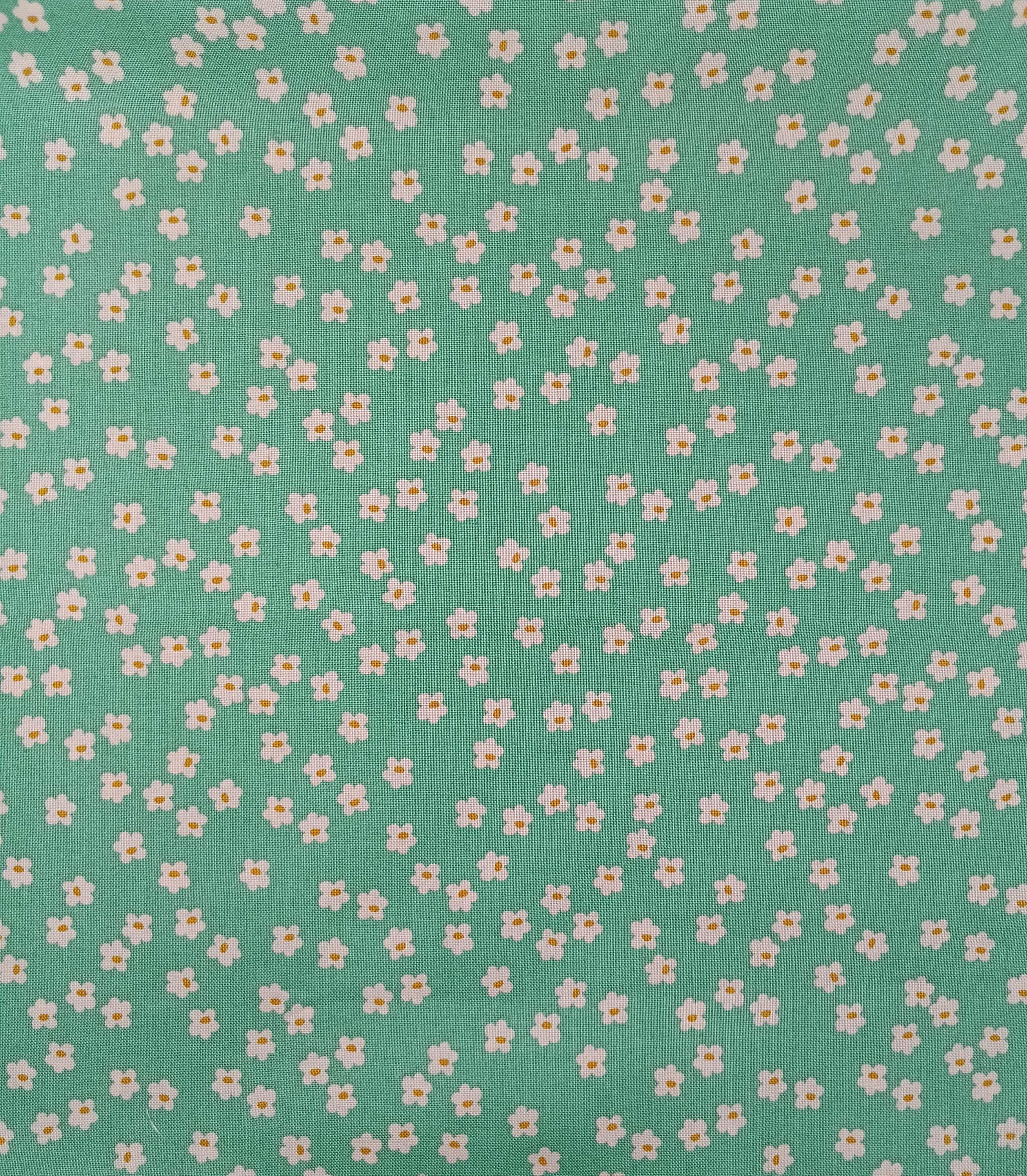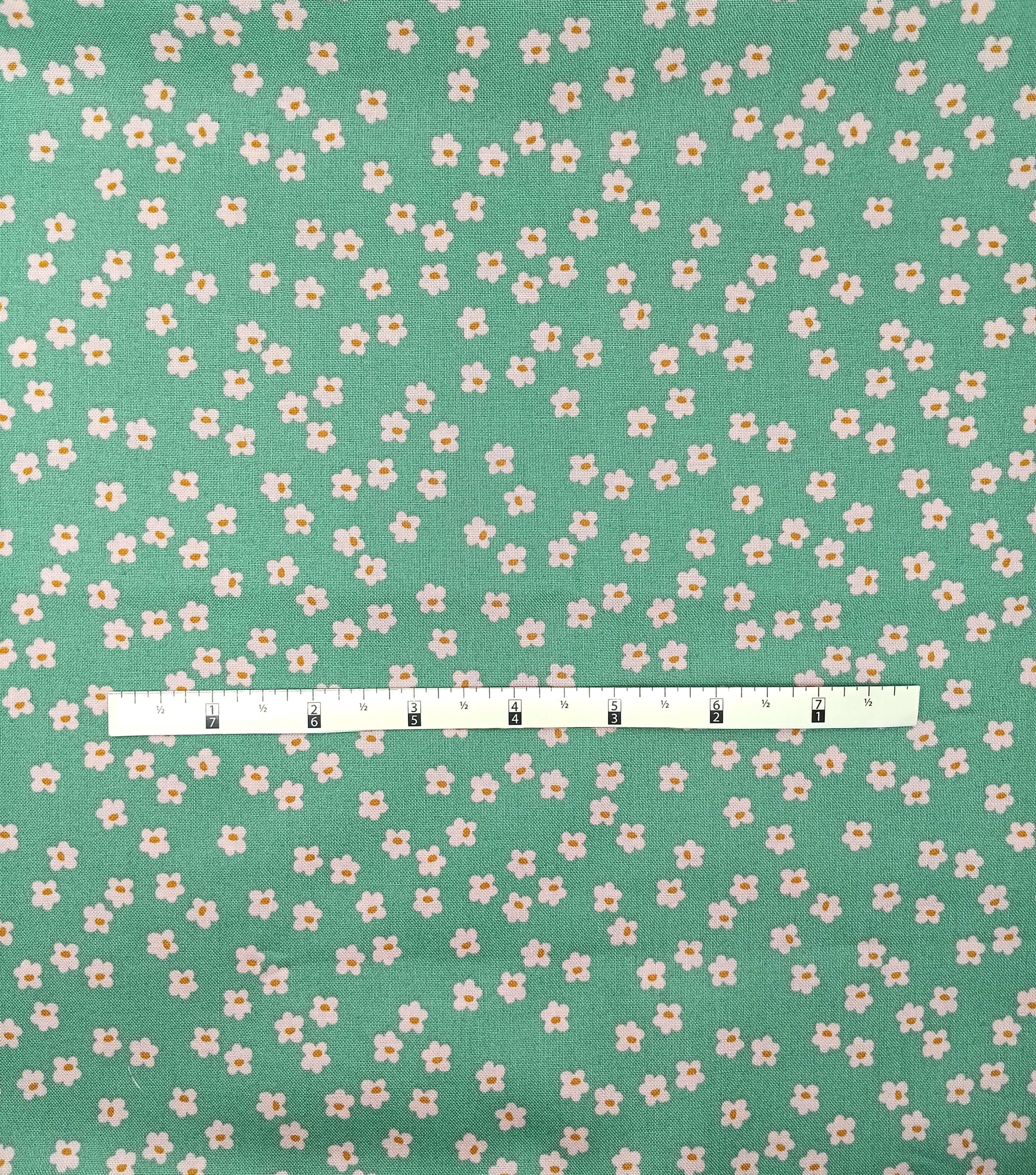 Depression 20s 30s Feedsack Reproduction 100% cotton fabricAndover Fabrics Pattern 1495 pink flowers on green backgroundTiny Blooms by Amy LattaWash warm, Tumble dryDo not dry cleanNo Bleach