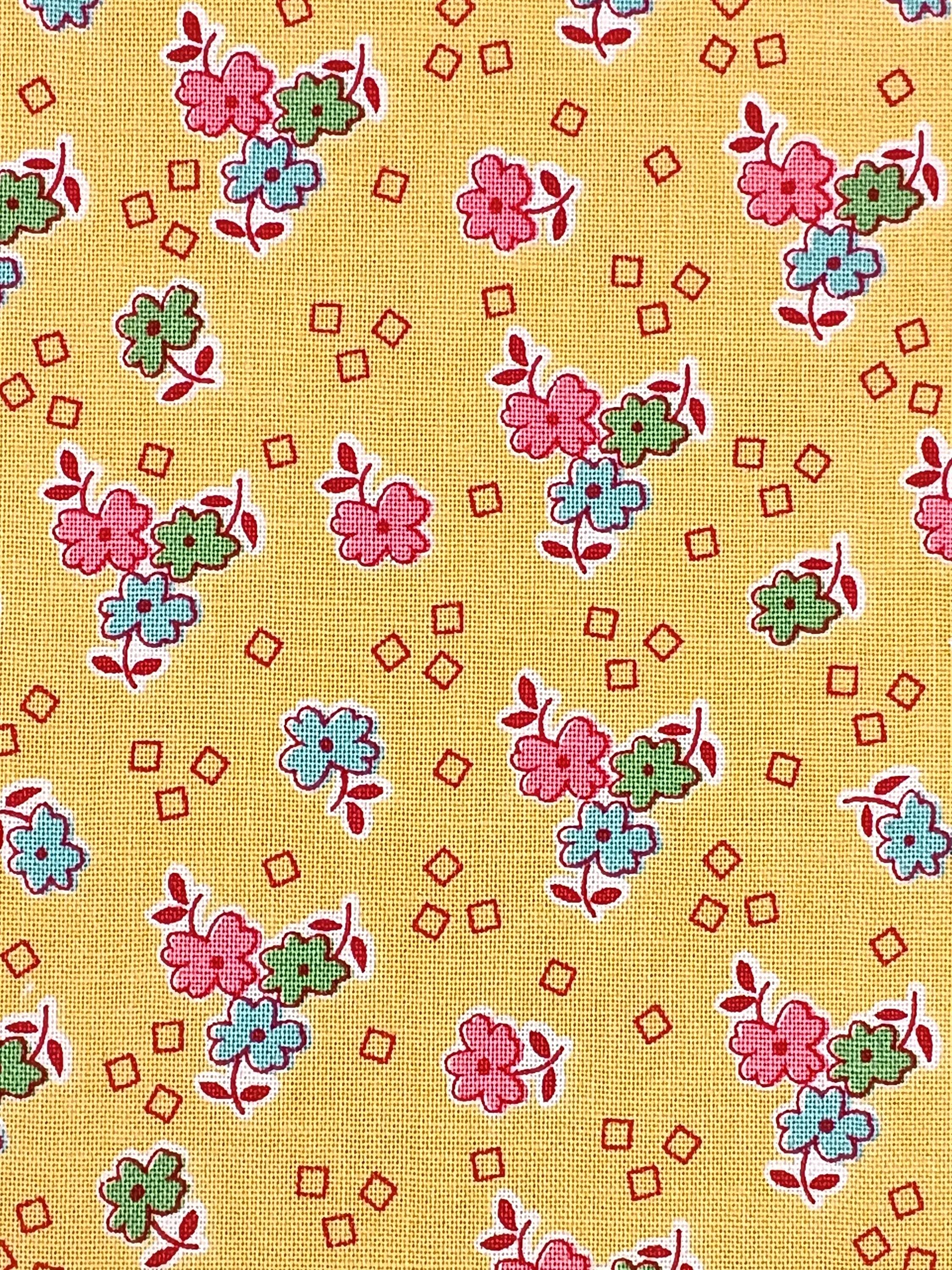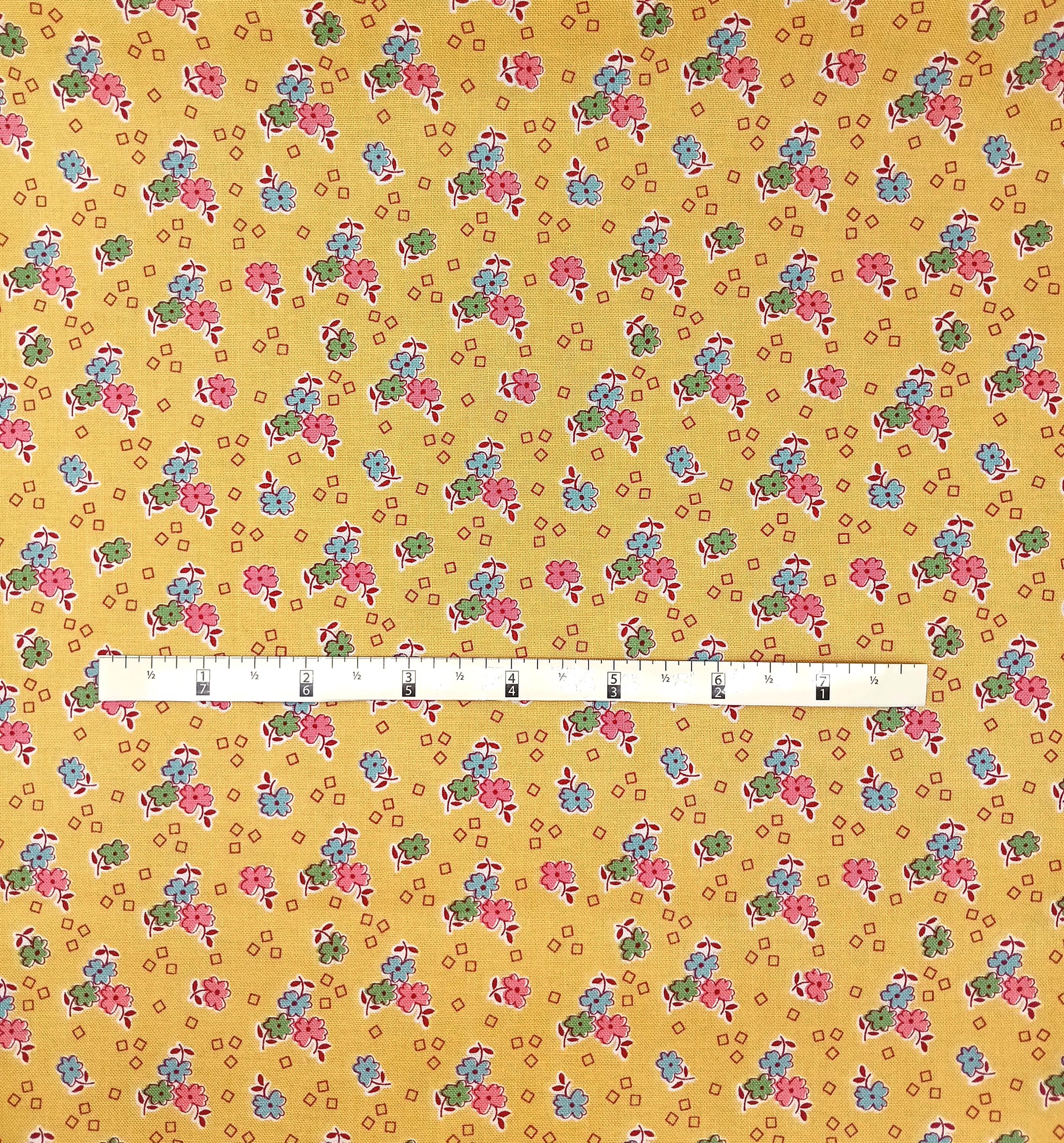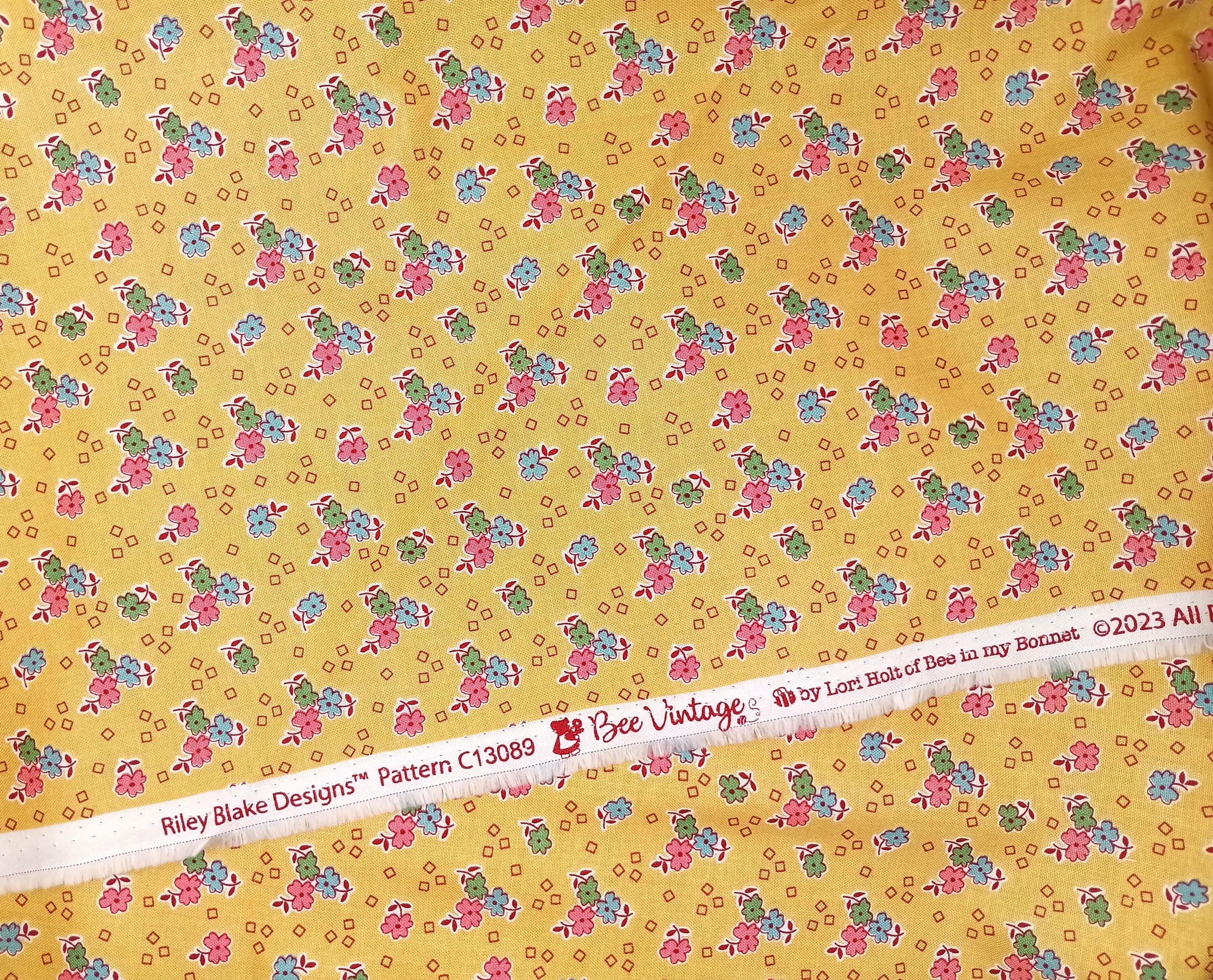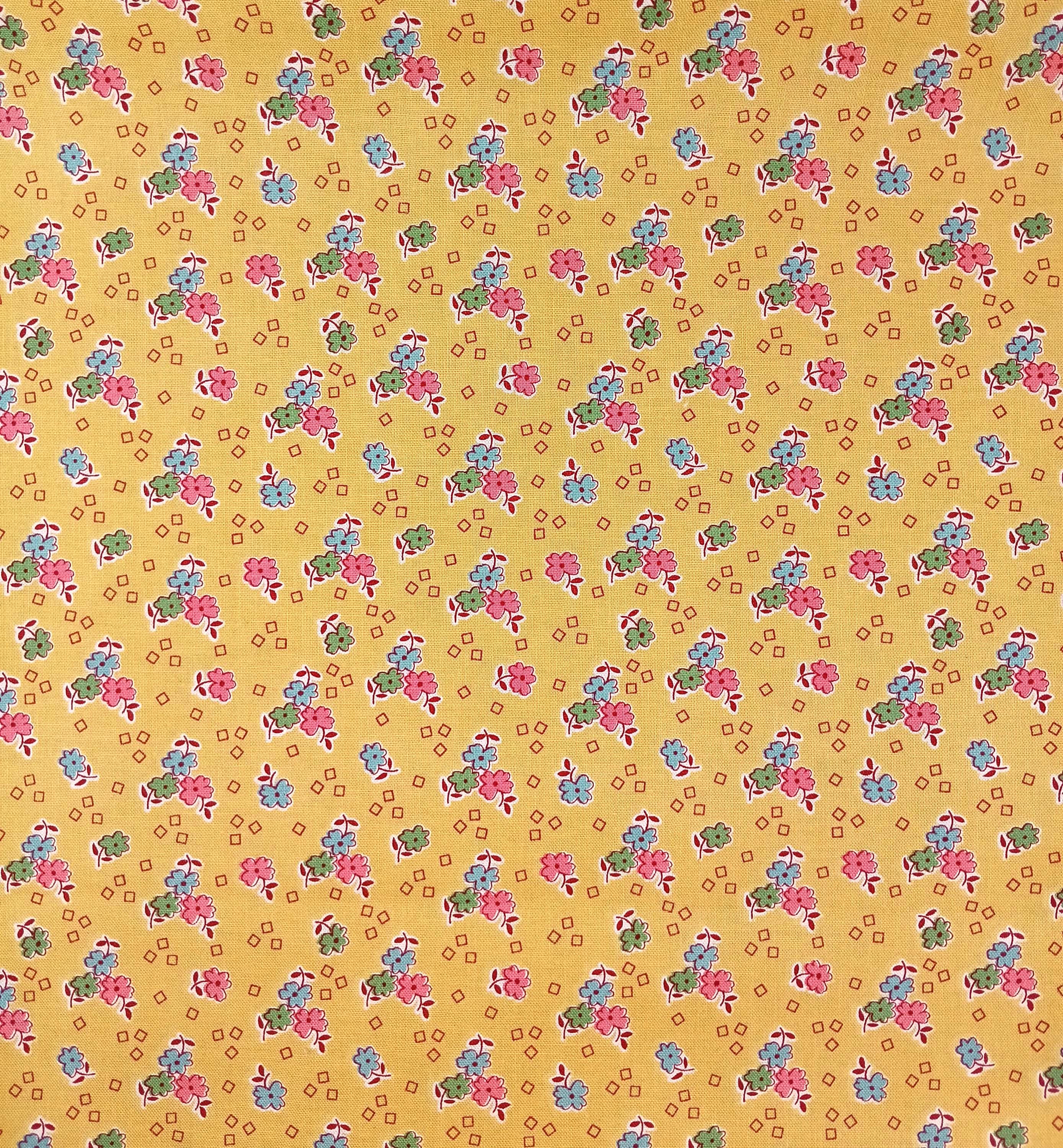 Depression 20s 30s Feedsack print RBD Designs C13089 Bee Vintage by Lori HoltPink, blue and green flowers on yellow background 100% cottonReproductionWash WarmNo dry cleaning